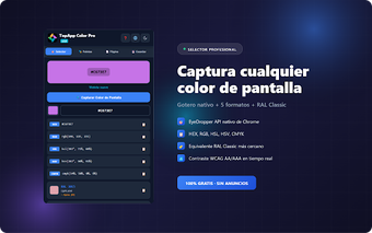 TopApp Color Proは、デザイナー、開発者、クリエイティブのために特別に設計された強力な色選択ツールです。このChrome拡張機能は、画面キャプチャ用のネイティブアイドロッパー、複数の色形式(HEX、RGB、HSL、HSV、CMYK)への対応、RALクラシックカラーの広範なデータベースなど、さまざまな機能を提供します。ユーザーは、WCAG準拠で色のアクセシビリティを簡単に確認し、プロジェクトに応じた幅広いオプションを確保するために、8種類の異なるタイプでカラーパレットを作成できます。